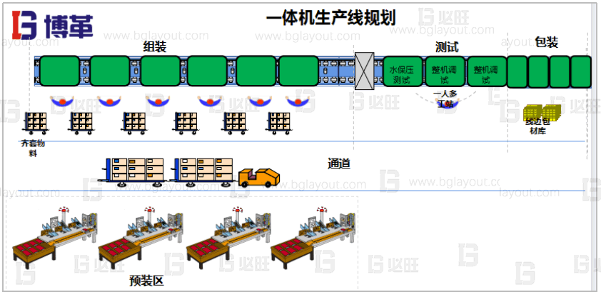采用模組式作業模式,由小部裝單元和整機裝配單元組成,實現柔性生產、保證工廠人均產值高效產出。